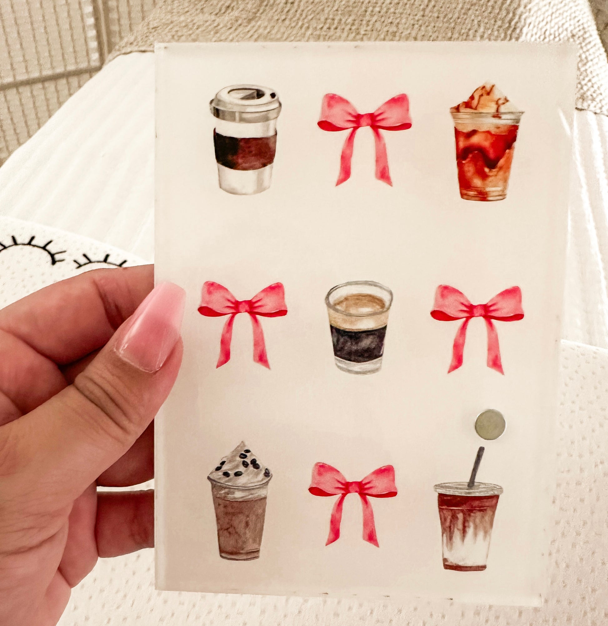 Coffee & bow acrylic lash tile with magnet to hold your tweezer.